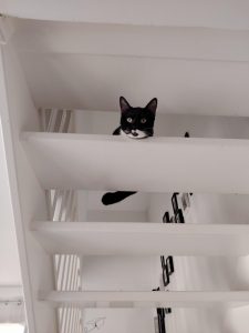 Et elle m’a répondu : « Oui, j’ai voulu vous faire la surprise ». Alors elle a ouvert la porte de la chambre d’amis et j’ai découvert un petit chaton noir et blanc très mignon mais un peu peureux.