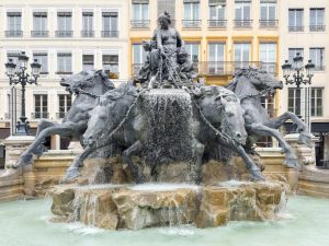 Cette fontaine devait voir le jour à Bordeaux d’où son nom d’origine « Char triomphal de la Garonne » car la ville de Bordeaux cherchait une sculpture pour la place des Quinconces mais ils ont finalement abandonné le projet. Bartholdi présente malgré tout son œuvre lors de l’Exposition universelle de Paris en 1889. C’est là que la ville de Lyon l’achète pour environ 100 000 francs (soit environ 15 200 euros). Après l’avoir installé en face de l’Hôtel de Ville, elle se trouve actuellement au Nord de la place. Voici deux images montrant cette modification !