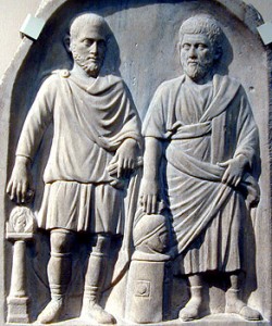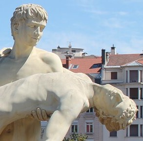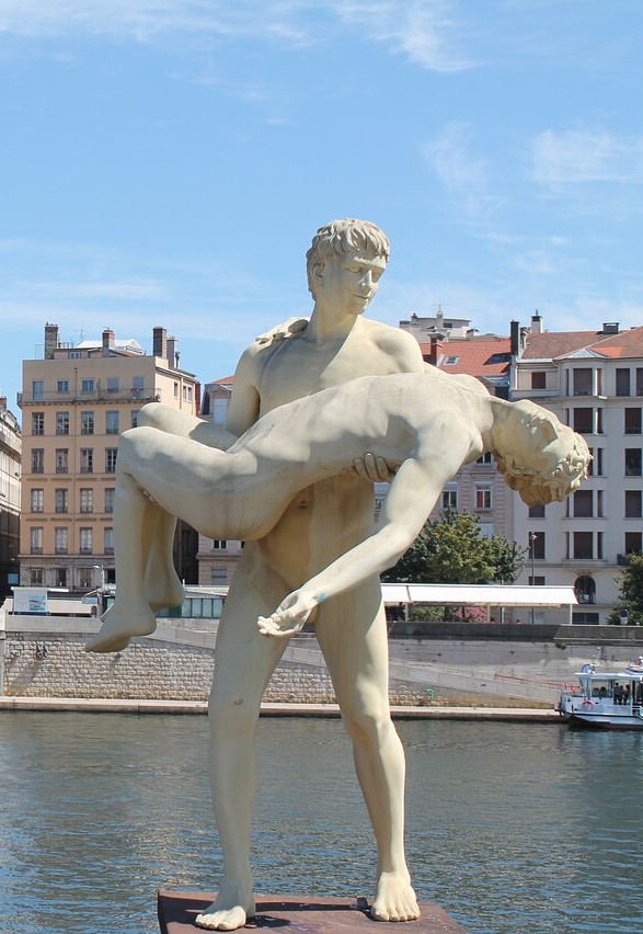Les artistes ont choisi de représenter un homme tenant dans ses bras un autre homme inanimé. Qui sont ces personnages ? Des héros de la mythologie ? Des héros d’aujourd’hui ? Pourquoi l’un des deux porte-t-il l’autre dans ses bras ?
