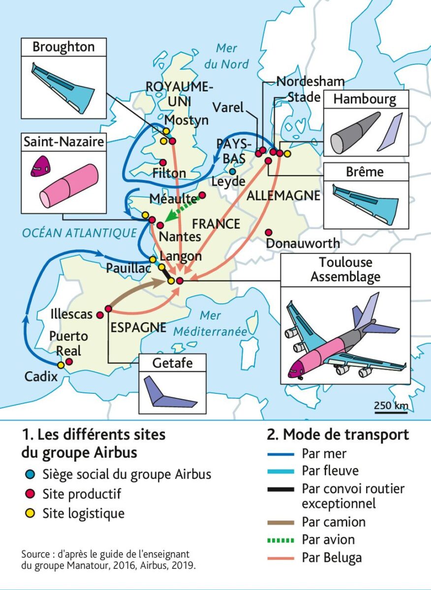 Un avion Airbus est imaginé et fabriqué en pièce détachées dans plusieurs pays d’Europe. Il est assemblé ensuite en France près de Toulouse. Airbus transporte les pièce détachées avec des avions de type Beluga.