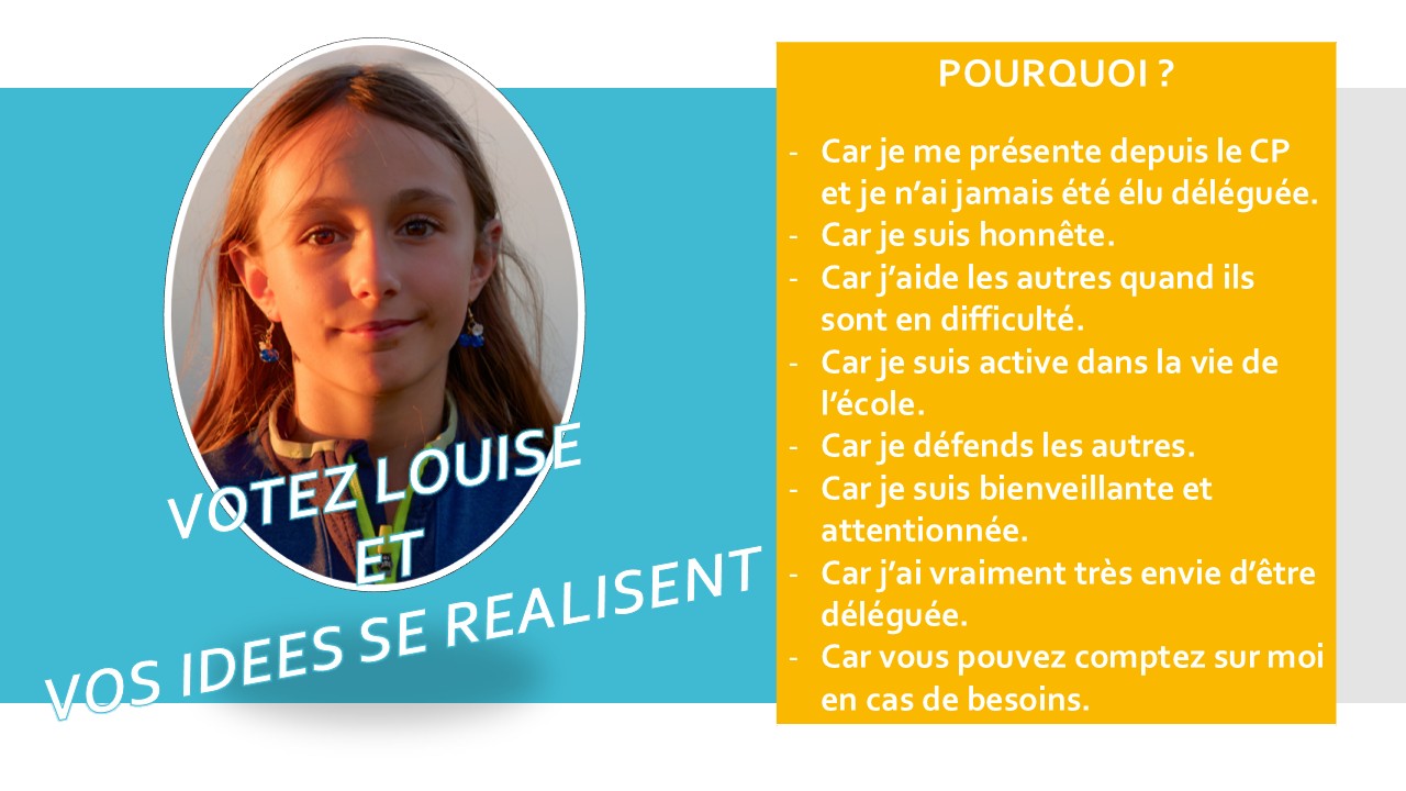 Bravo à toi aussi pour ta candidature pour les élections de délégués, toi aussi tu seras notre déléguée. Fais nous rêver cette année scolaire Louise ! 🥰😍